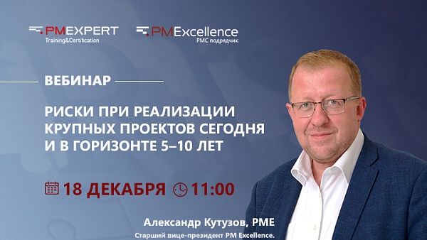 18 декабря в 11:00 (мск) старший вице‑президент PM Excellence Александр Кутузов, PME, проведет вебинар «Риски при реализации крупных проектов сегодня и в горизонте 5–10 лет» для инвесторов, руководителей капитального строительства и представителей корпораций развития.